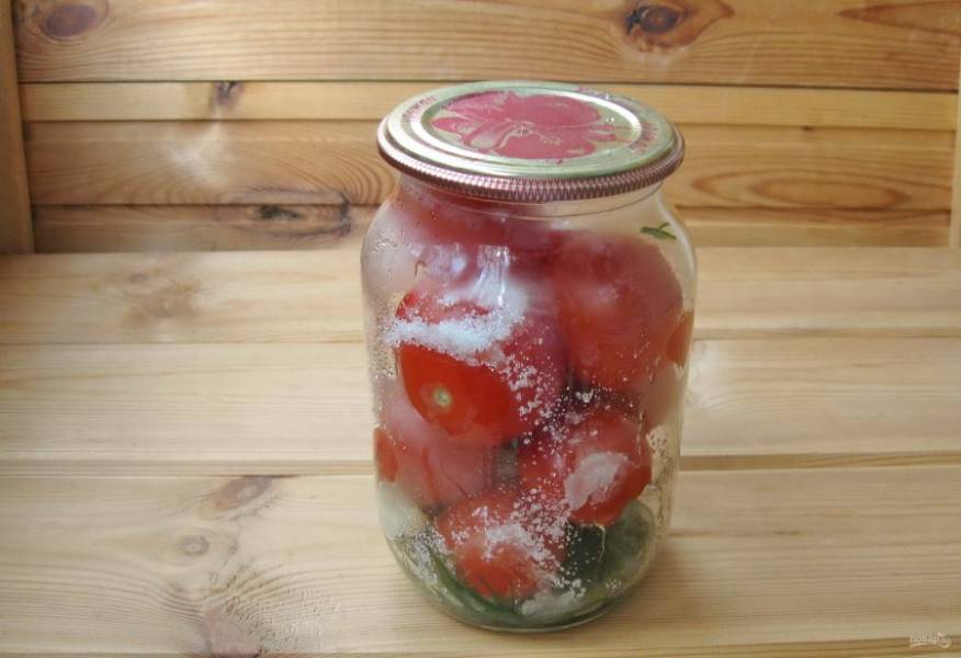 Вскипятите воду. В литровую банку с зеленью, чесноком и помидорами входит 500 мл воды. Залейте помидоры кипятком, накройте стерилизованными крышками и дайте постоять 20-25 минут. Затем воду слейте в кастрюлю. Снова доведите воду до кипения и второй раз залейте помидоры в банках.