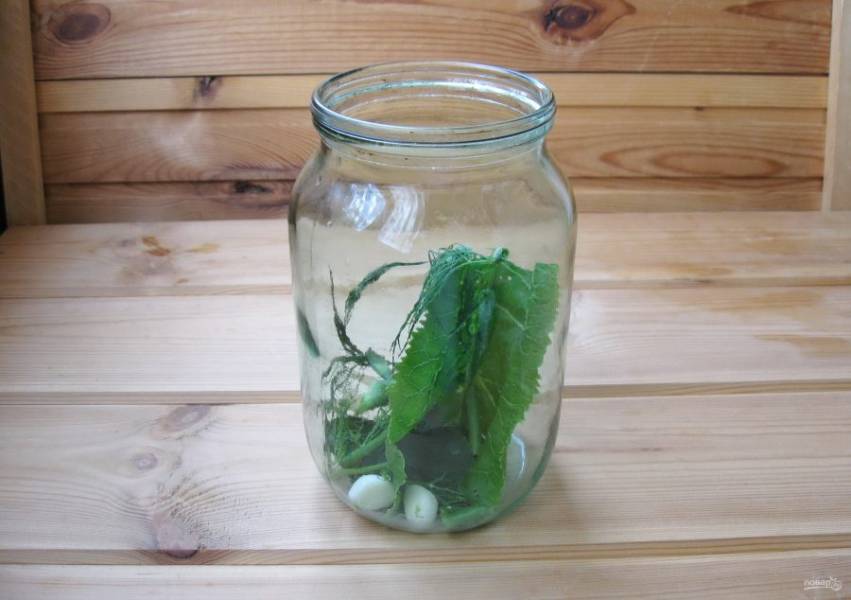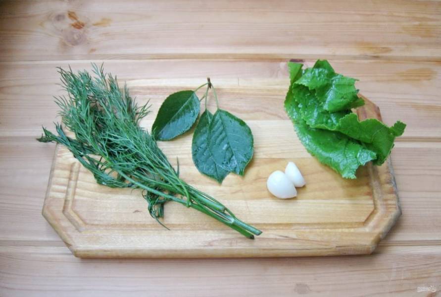 Листовой хрен, укроп, листья вишни и чеснок нарежьте и выложите в стерилизованные банки.