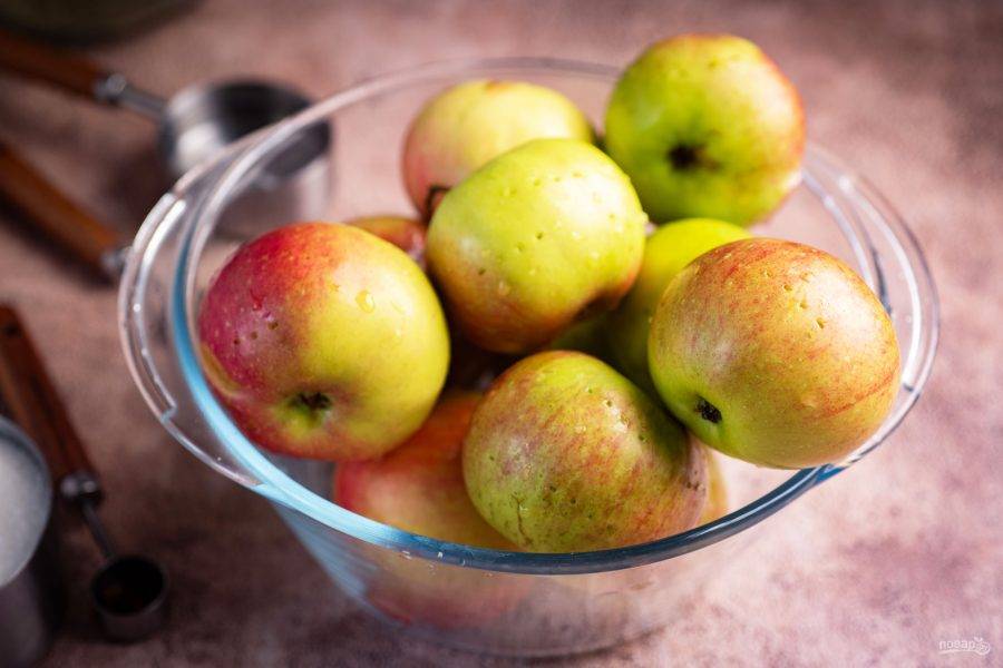 Для приготовления возьмите хорошие крепкие яблоки, без червоточин и пятнышек, тщательно вымойте под проточной водой и наколите их вилкой в нескольких местах.