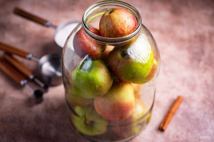 Яблоки выложите в чистую банку (у меня трехлитровая) до "плечиков".