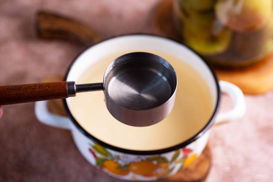Эту воду слейте в кастрюлю, добавьте сахар, перец, гвоздику, корицу. Доведите до кипения. После чего добавьте уксус. Маринад готов.
