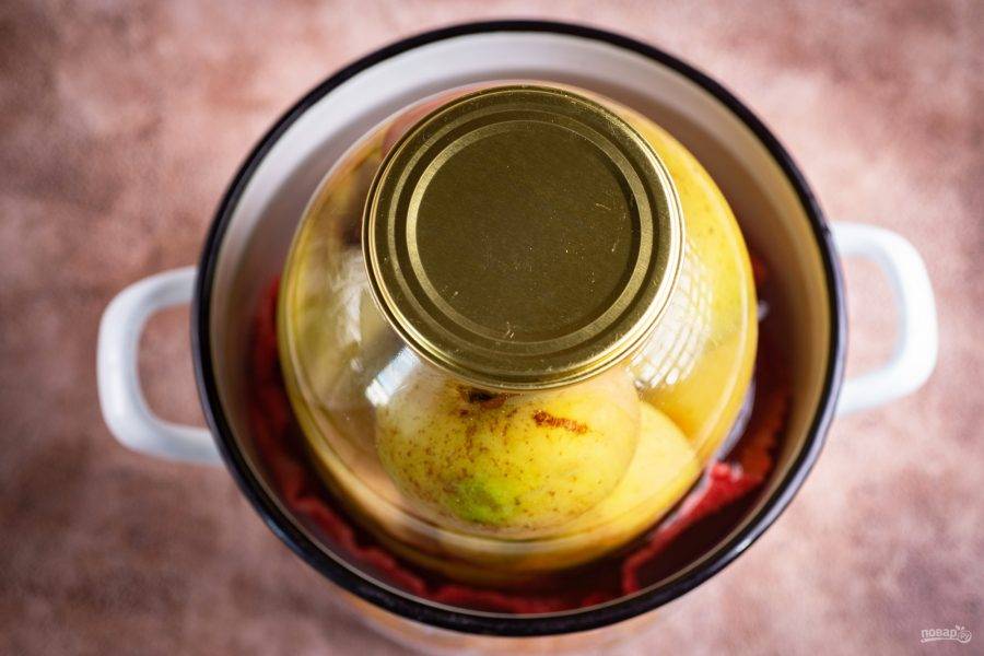 Банку прикройте крышкой, поставьте на дно просторной кастрюли, которое уже застелили предварительно кухонным полотенцем. Налейте воды между банкой и стенкой кастрюли до максимально возможного уровня и доведите на среднем огне до кипения. Стерилизуйте банку с маринованными яблоками 25-30 минут.