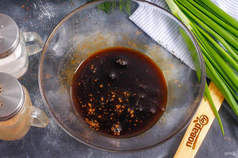 Влейте соевый соус и уксус, аккуратно все перемешайте. Без уксуса у вас получится не маринад, а рассол.