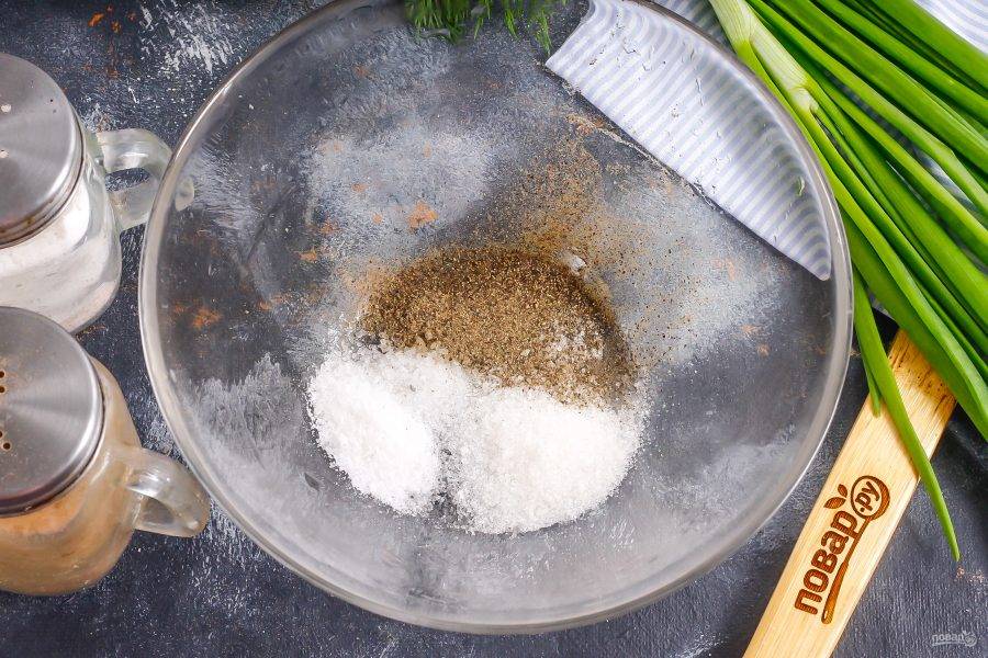 В глубокую емкость всыпьте соль, молотый черный перец и сахар. По желанию можете добавить и другие пряности или специи.