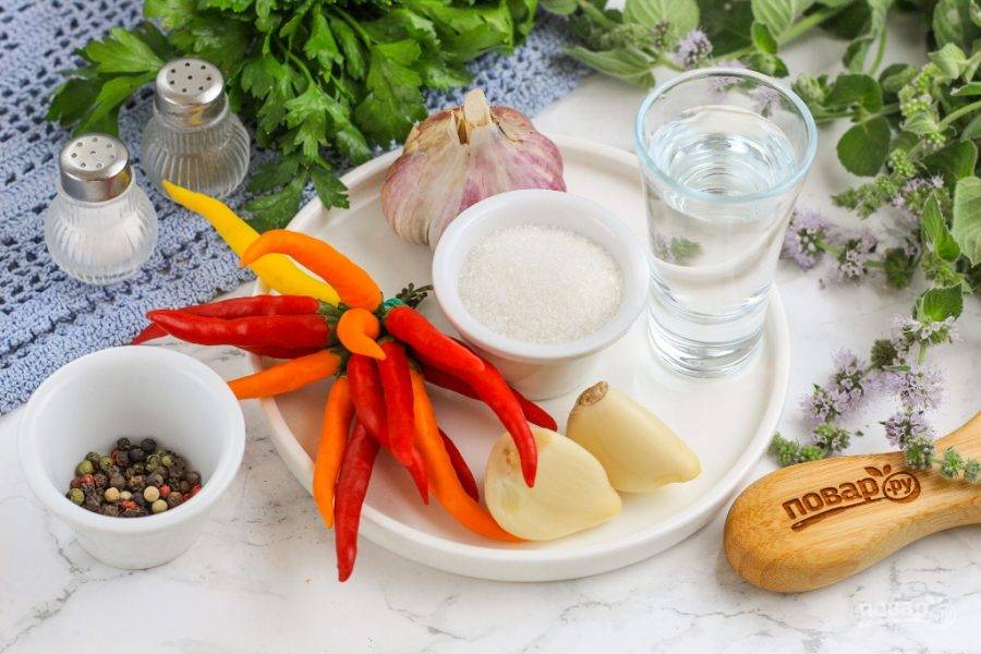 Подготовьте указанные продукты. Перцы промойте, срежьте стебли, чесночные зубчики очистите от шелухи.