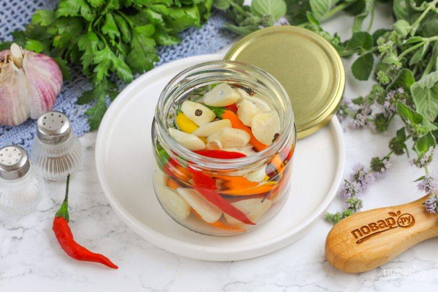 Закрутите крышку на банке и тщательно все взболтайте, чтобы сахар растворился. Поместите емкость в холодильник и оставьте на 2-3 дня. Каждый день взбалтывайте емкость с перцем. По истечении данного времени закуску можно пробовать. Перец будет отлично храниться на холоде в маринаде не менее полугода!