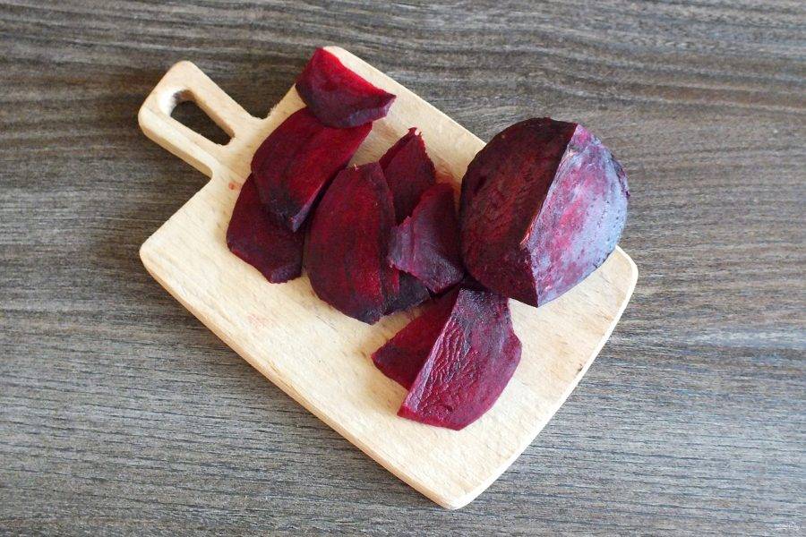 Свёклу очистите от кожуры и нарежьте тонкими пластинками.