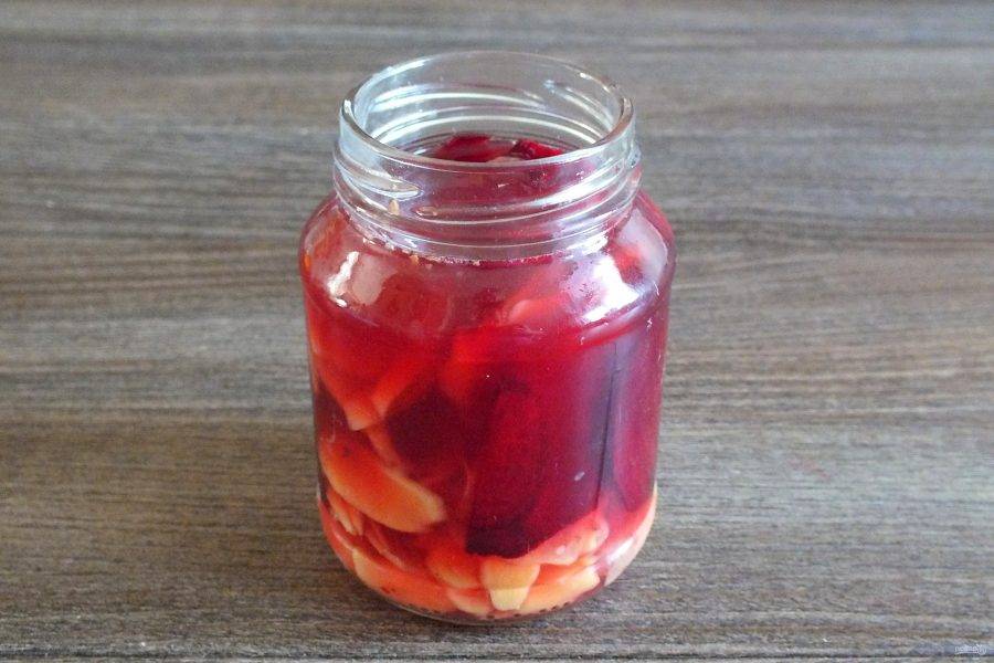 Пластинки свёклы добавьте к имбирю. Залейте маринадом. Если имбирь не покрылся полностью маринадом, сверху долейте яблочным уксусом, чтобы баночка была полной. Прикройте крышкой и оставьте при комнатной температуре на 3 дня.