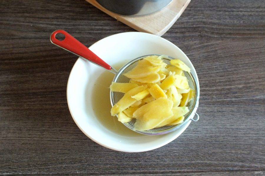 Имбирь откиньте на сито, дайте стечь жидкости.