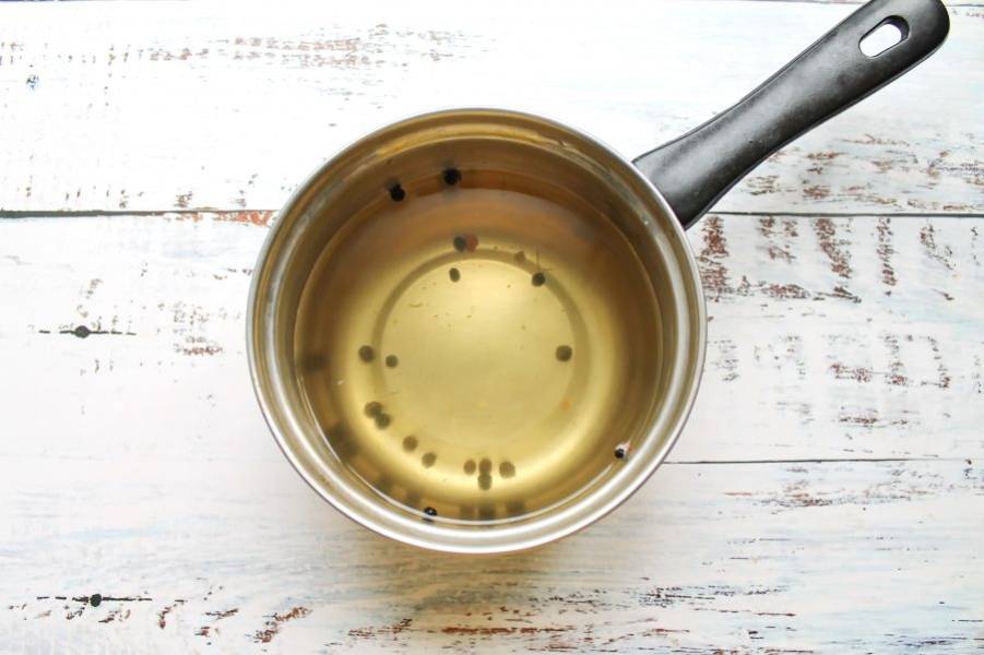 Слейте жидкость в кастрюлю, добавьте перец горошком, соль и сахар. Доведите все до кипения и влейте уксус, сразу залейте маринад обратно в банку и закатайте.