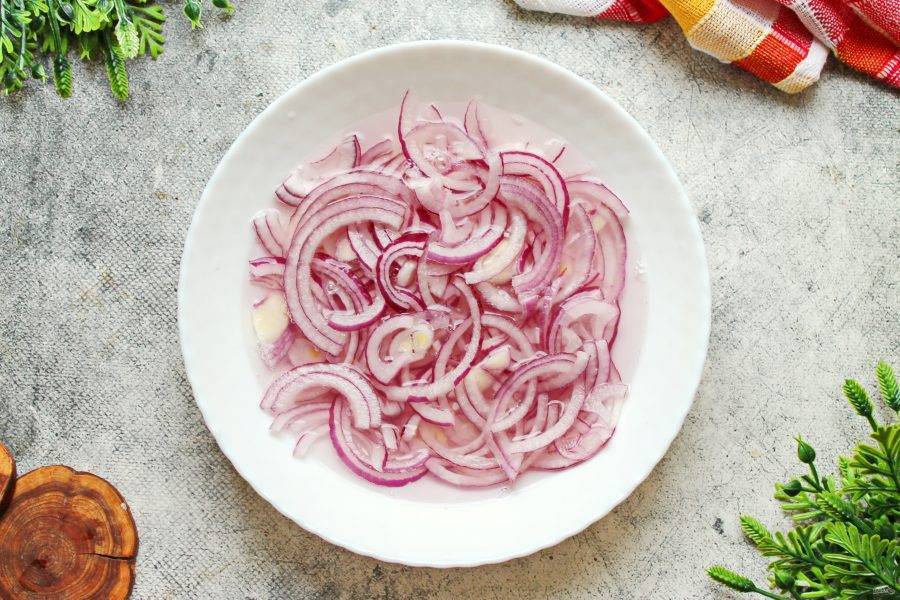 Влейте в лук уксус и залейте все горячей водой, чтобы она покрыла полукольца. Перемешайте и оставьте на 10 минут. После этого откиньте лук на сито и дайте стечь жидкости, ее оставьте, может пригодиться.