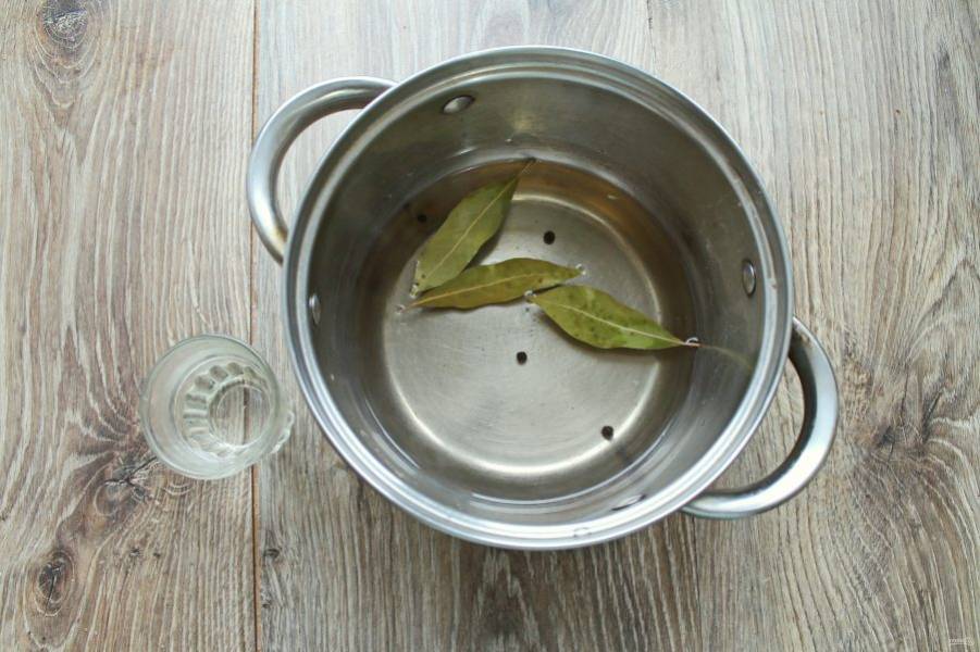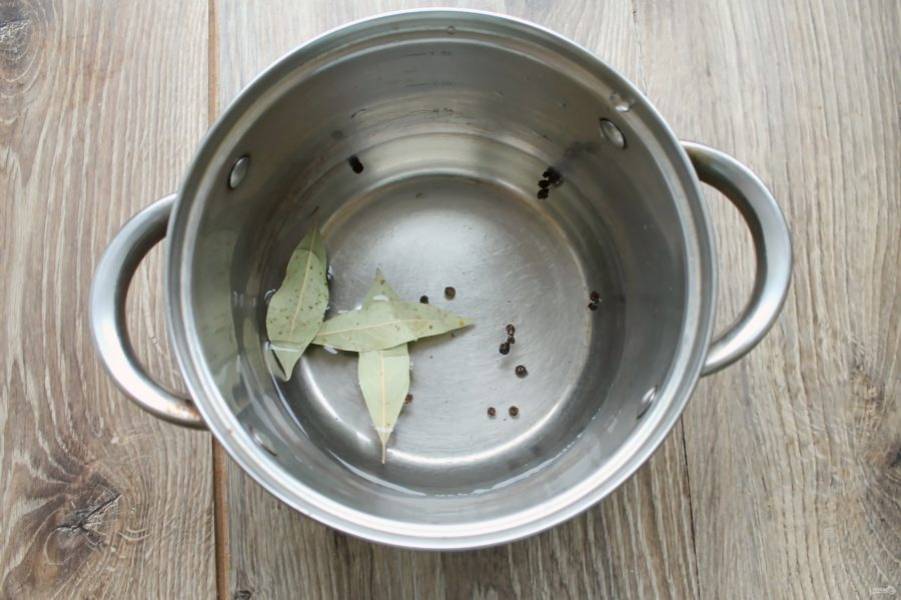 В кастрюлю влейте чистую воду, выложите лавровые листья и перец. Доведите воду до кипения.