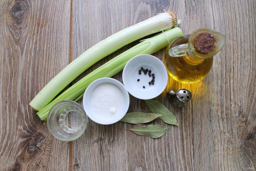 Подготовьте все необходимые ингредиенты для приготовления маринованного лука-порея. У лука удалите верхние испорченные листья и отрежьте жесткую, зеленую часть.