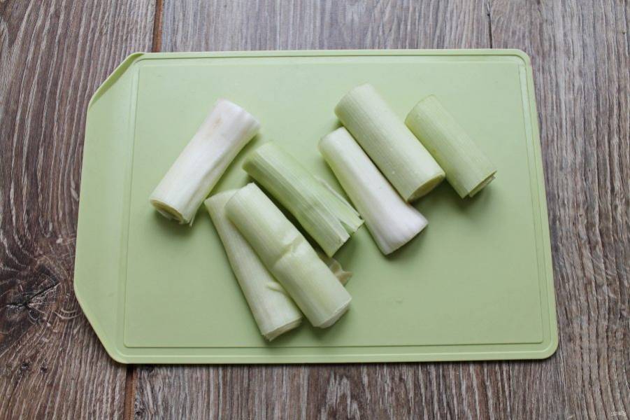 Лук-порей порежьте на кусочки, очень толстые участки можно разрезать на 2-4 части.