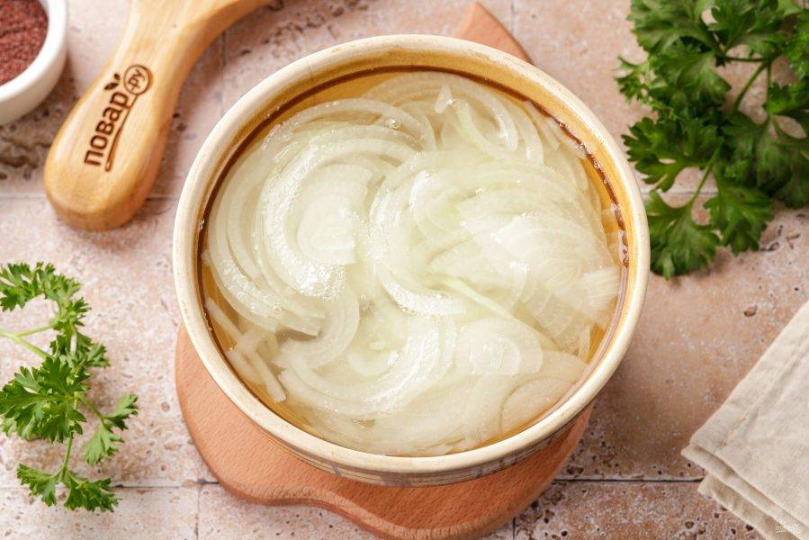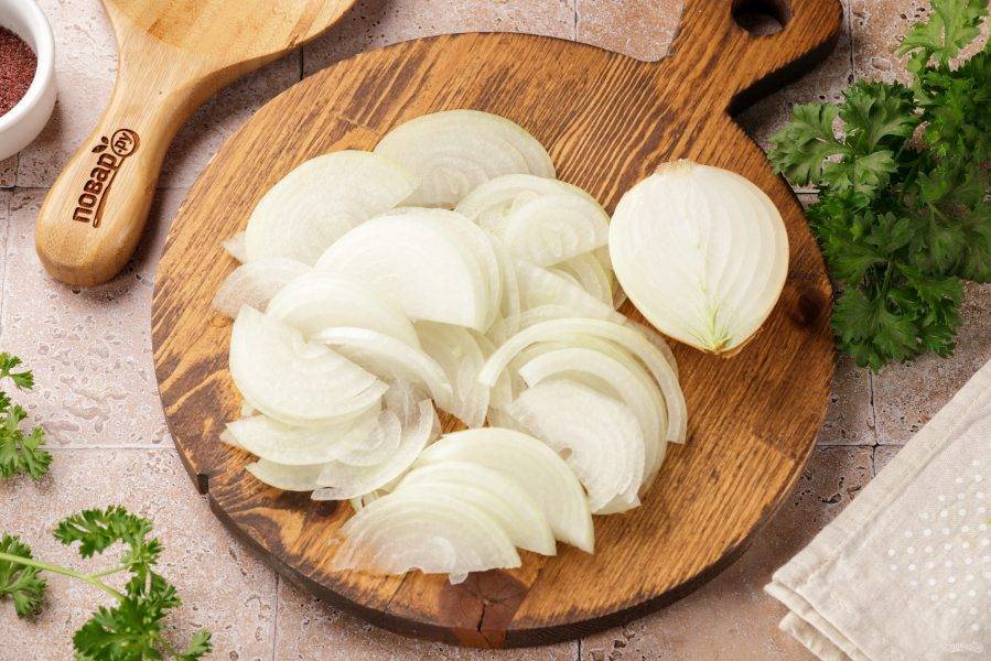 Репчатый лук можете нарезать произвольно, как вам больше нравится (соломка, кольца, полукольца и т.д.) и переложите в миску.