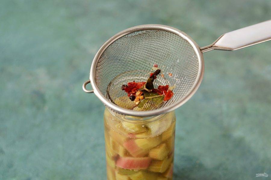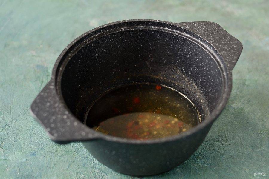 Для маринада вскипятите воду, добавьте все специи, сахар и соль, проварите пару минут. В конце влейте уксус.