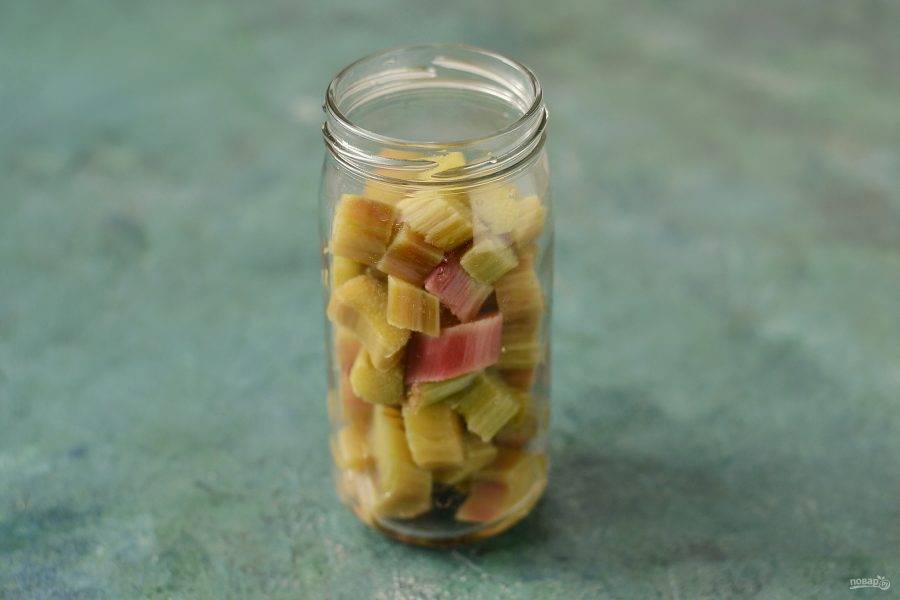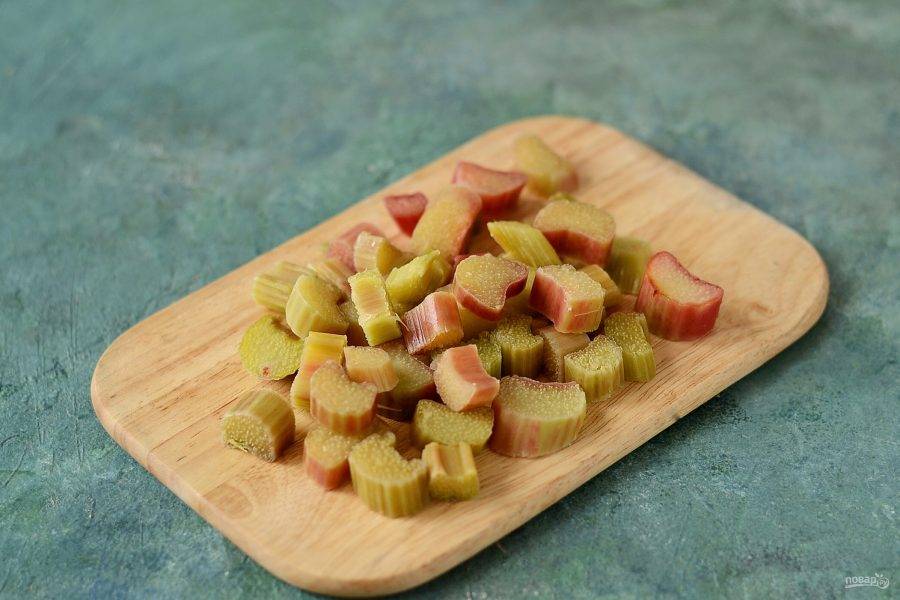 Ревень нарежьте кружочками. Если стебель слишком жесткий, то предварительно очистите его с помощью овощечистки.