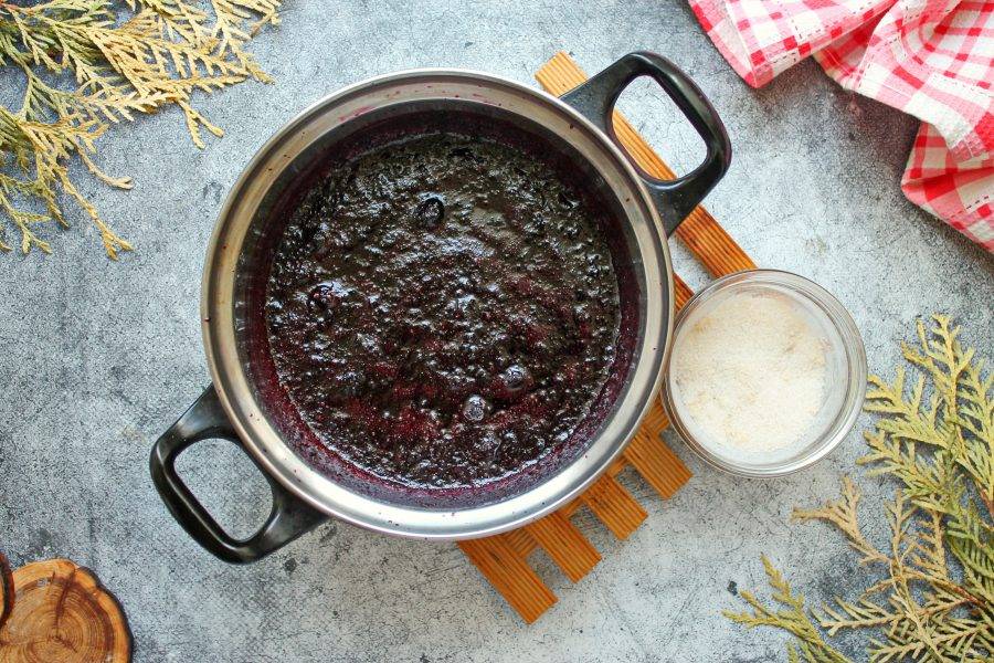 Агар-агар смешайте с 50 миллилитрами остывшего отвара и дайте постоять 5 минут. Влейте, мешая, агар в черную рябину. Перемешайте. Готовьте еще 2 минуты и снимите с огня.