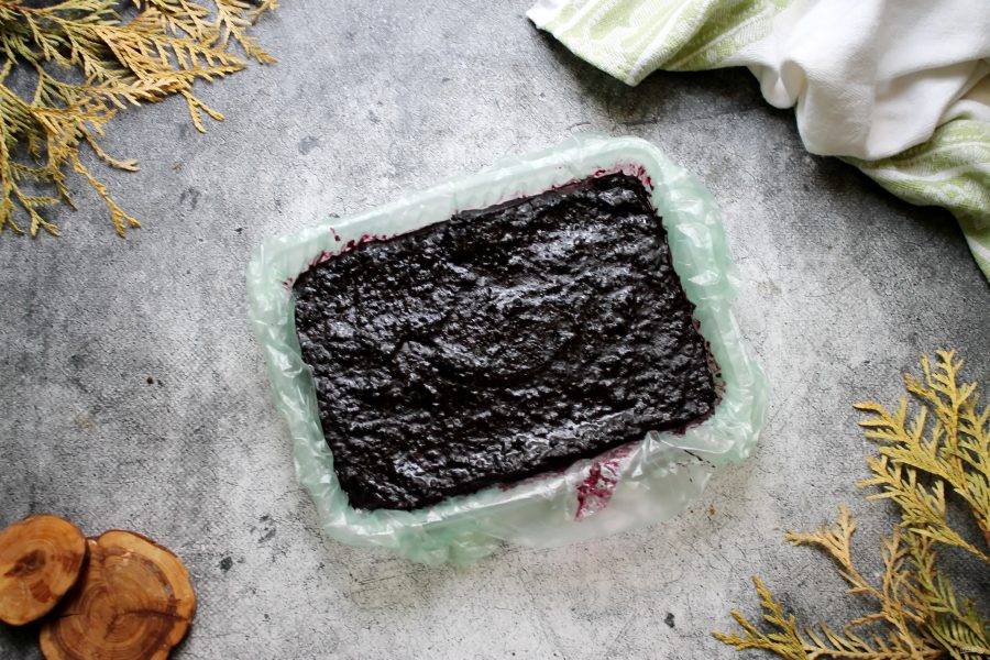 Форму застелите пленкой, переложите массу и разровняйте. Дайте мармеладу полностью остыть и уберите в холодильник до полной стабилизации.
