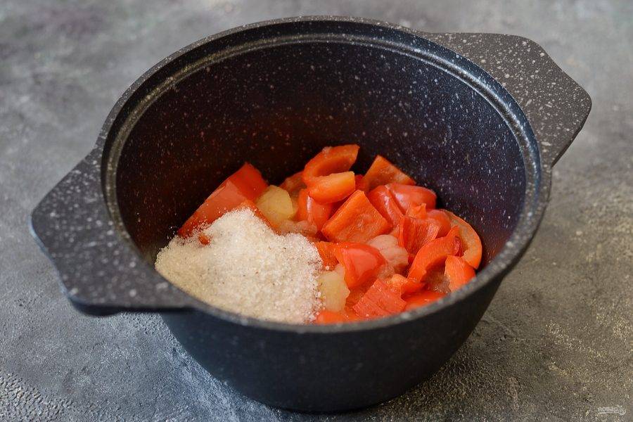 Когда овощи размягчатся, добавьте все специи, сахар и соль. Перемешайте и еще раз доведите до кипения.