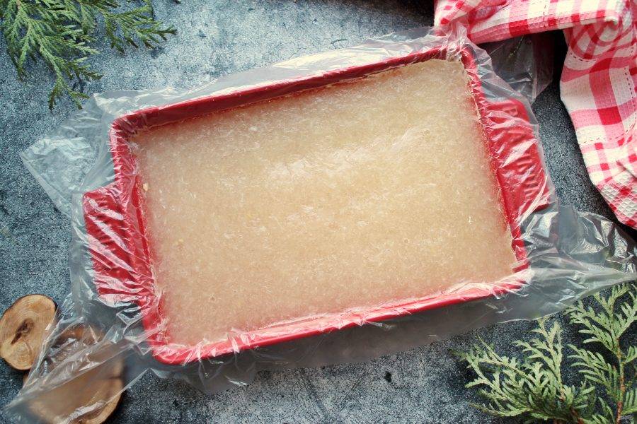 Подходящую форму застелите пленкой и вылейте желейную массу. Дайте ей полностью остыть и уберите в холодильник на несколько часов для полного застывания. После этого разрежьте мармелад на квадратики, посыпьте сахаром и подавайте к столу.
