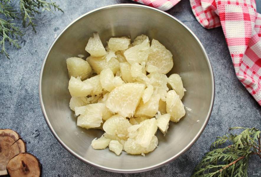Помело хорошо вымойте, обсушите, разрежьте поперек на 2-3 части и извлеките мякоть.