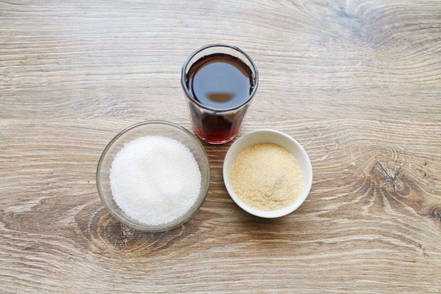 Желатин насыпьте в миску и залейте половиной вина. Оставьте на столе для набухания в течение 40-60 минут, в зависимости от инструкции.