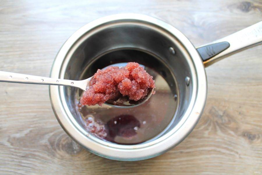 После того как желатин набухнет, налейте в кастрюлю красное вино и поставьте на средний огонь.