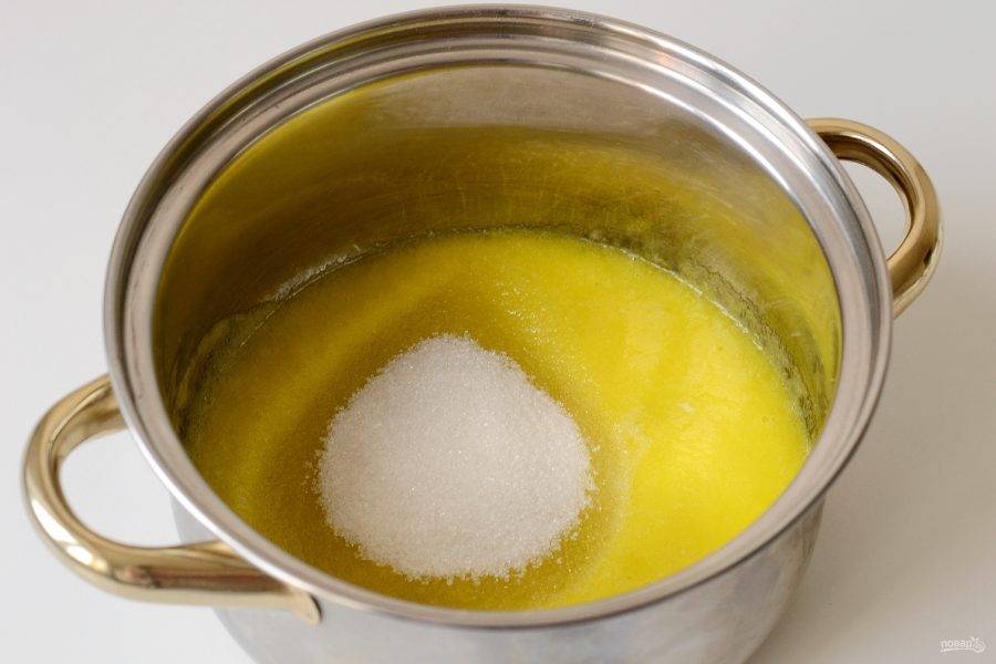 В кастрюлю налейте сок с мякотью, добавьте сироп и оставшийся сахар.