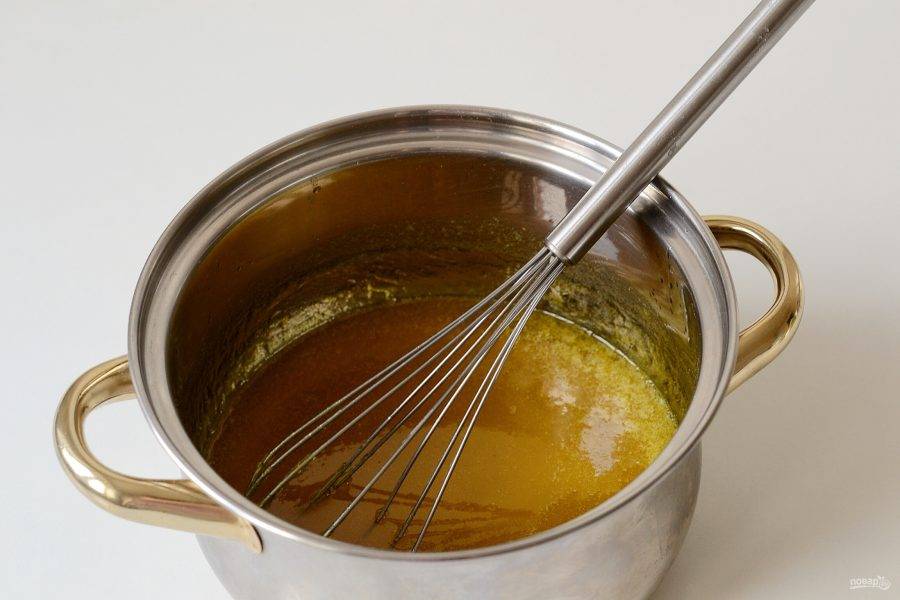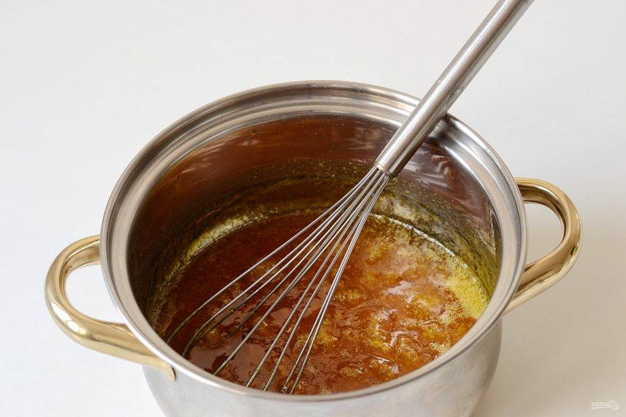 Варите массу на среднем огне, постоянно помешивая. Постепенно доведите температуру до 110 градусов. Снимите жидкость с огня, влейте воду с лимонной кислотой и перемешайте.