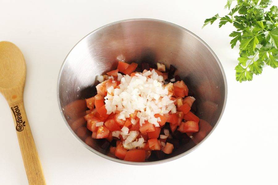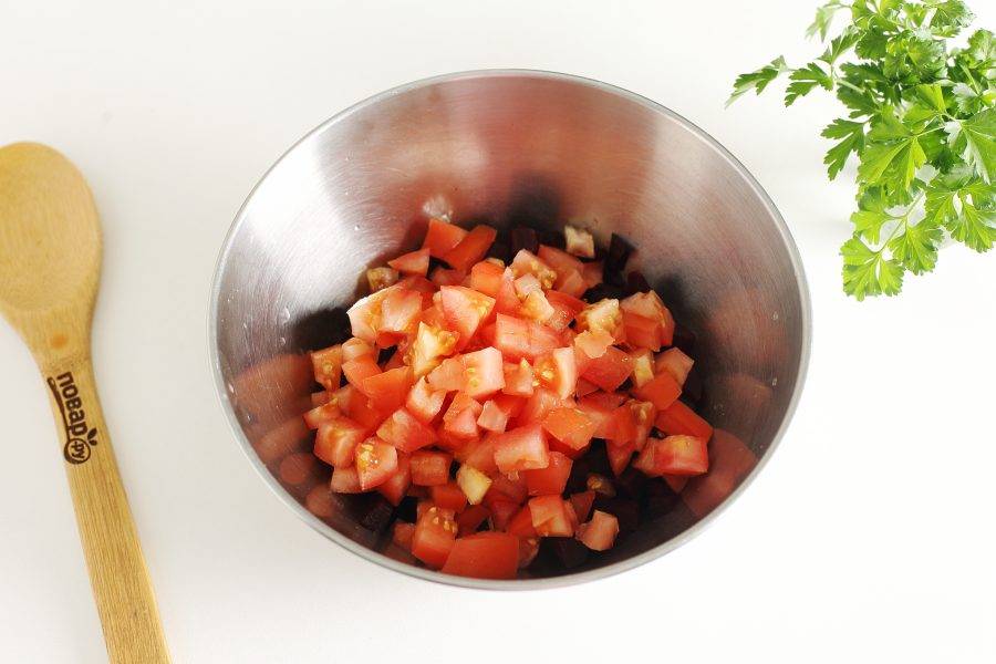 Кубиками нарежьте помидор.