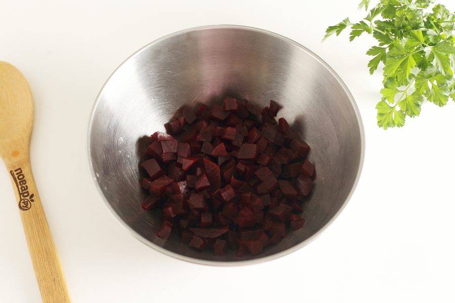 Свеклу заранее необходимо запечь или отварить. Время приготовления дано без учета варки. Готовую свеклу очистите и нарежьте кубиками.