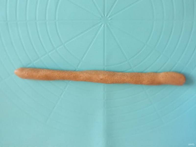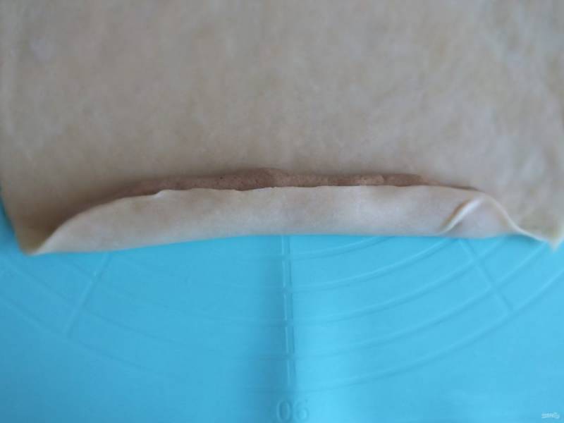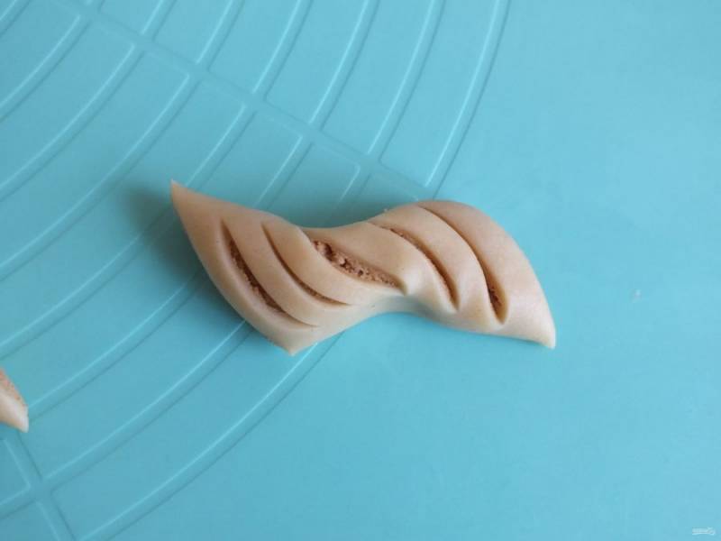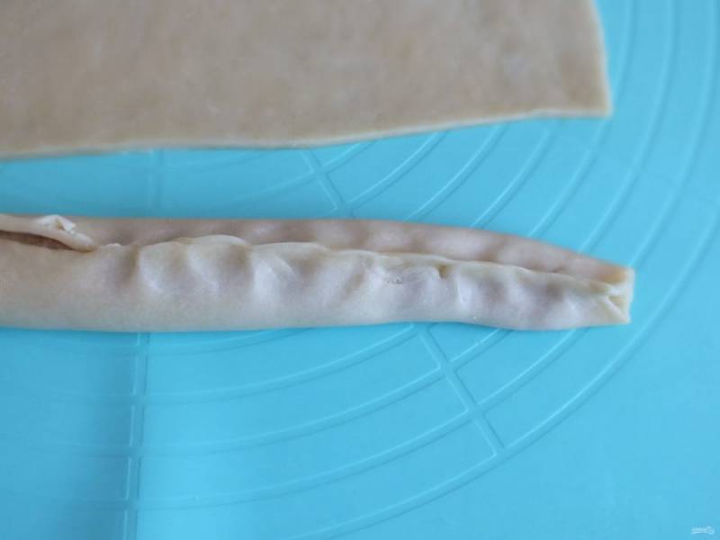 Жгутик из арахисовой пасты положите на тесто и прикройте краем.