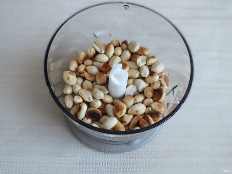 Приготовьте начинку. Обжаренный арахис поместите в блендер.