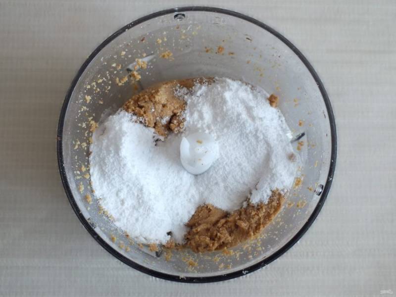 Добавьте сахарную пудру. Если вы пробили 1/3 арахиса, то и сахарной пудры добавьте 1/3.