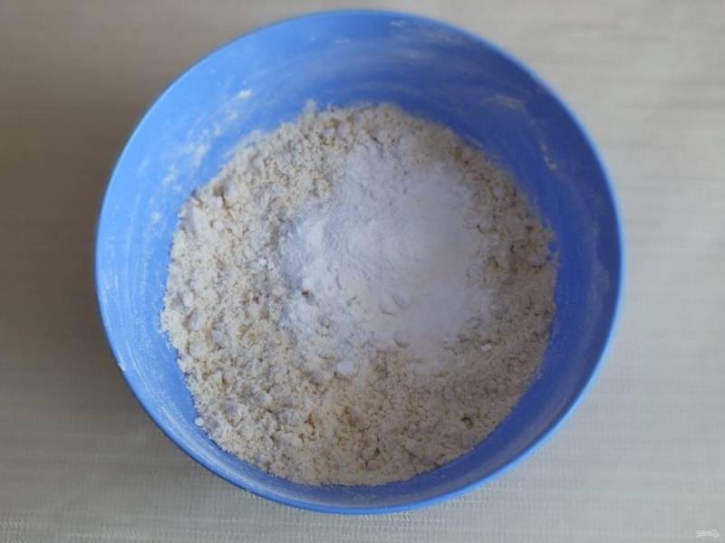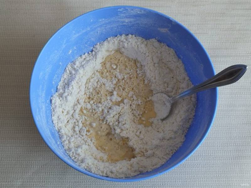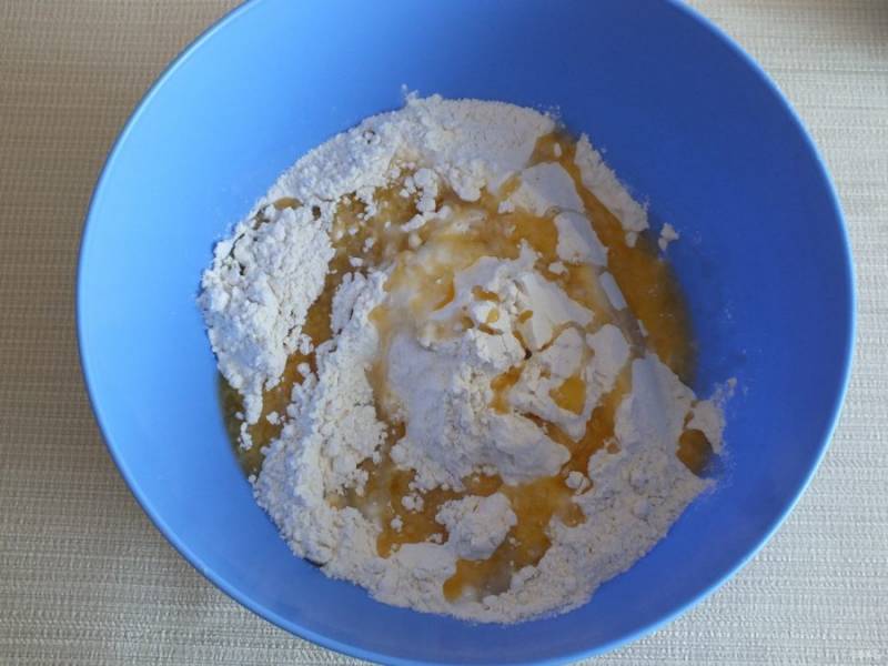 Возьмите глубокую чашу. Насыпьте муку, добавьте масло.