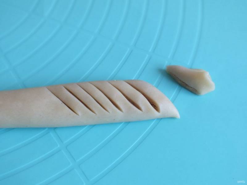 Отрежьте кусочек. Возьмите двумя пальцами посредине заготовки и сдавите.