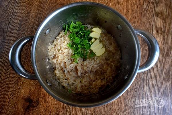 Всыпьте рис, обжарьте его в течение 1-2 минут. Рис впитает в себя ароматное масло. Влейте кипяток, посолите, накройте крышкой и варите на медленном огне примерно 20 минут, пока рис не впитает в себя всю воду.