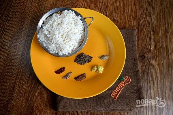 Подготовьте необходимые ингредиенты. Рис нужно заранее промыть в нескольких водах до прозрачности, а потом залить холодной водой на 15 минут. Откиньте на сито.