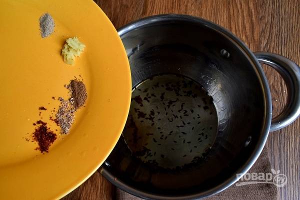 В кастрюле с толстым дном разогрейте масло и обжарьте семена кумина (зира) до потемнения. Добавьте остальные специи, перемешайте. Если вы не любитель острого, замените перец чили на сушеную паприку.