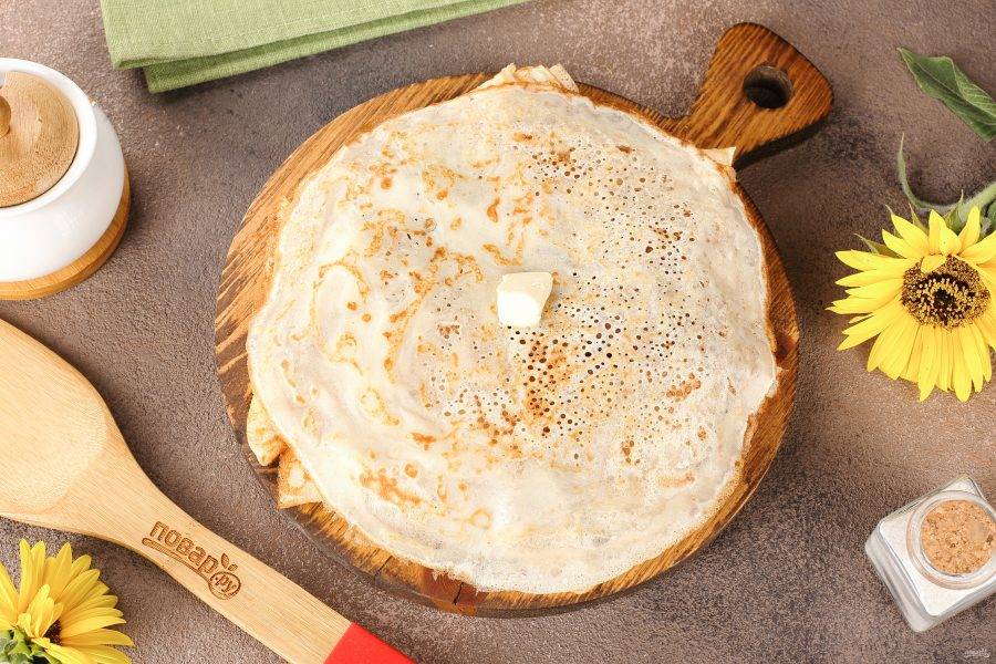 Готовый блинчик снимите с огня и выложите по центру небольшой кусочек сливочного масла.