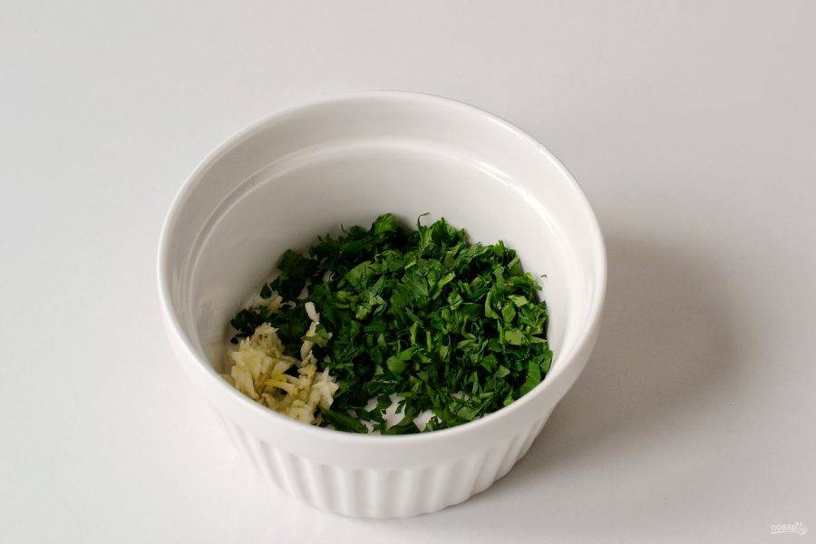 Петрушку мелко порубите. Чеснок пропустите через пресс.