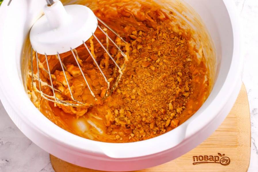Всыпьте крошку печенья в чашу кухонного комбайна или миксера. Аккуратно вымешайте крем силиконовой лопаткой или ложкой, вилкой, но не венчиком.