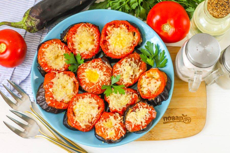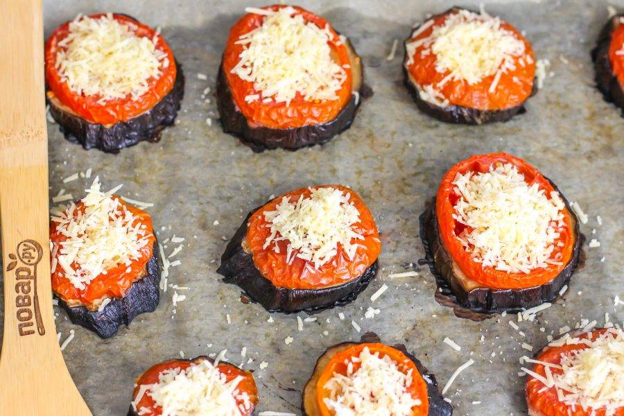 Выложите на баклажаны ломтики помидоров. Разогрейте духовку до 200 градусов и запеките в ней овощи примерно 15 минут до мягкости баклажанной нарезки.