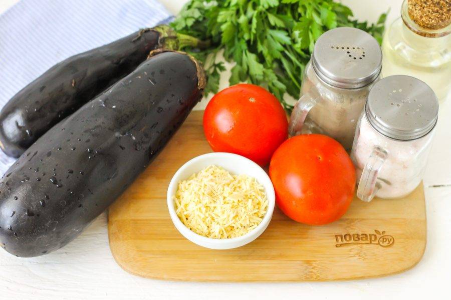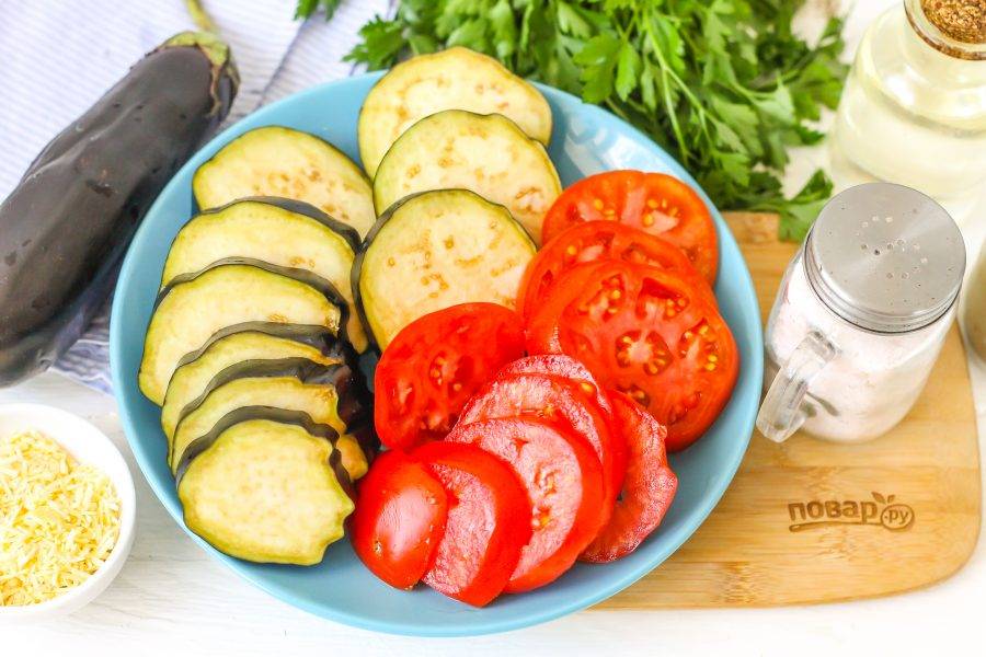 Промойте овощи в воде, срежьте у баклажанов хвостики, а из помидоров вырежьте зеленые сердцевинки. Нарежьте все овощи кружочками не толще 1-1,5 см.