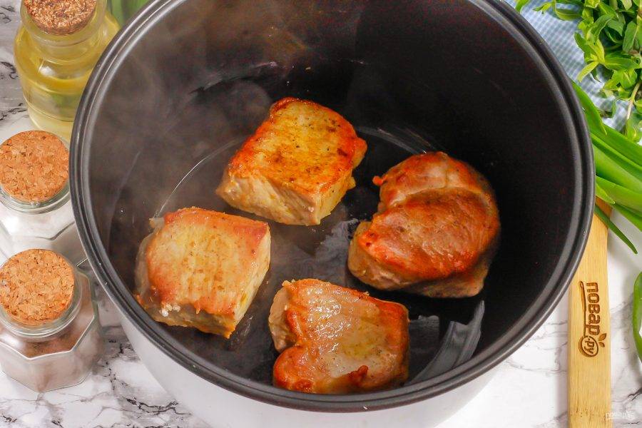 Активируйте режим "Жарка" на табло мультиварки на 15 минут. Влейте в чашу растительное масло и прогрейте его 2-3 минуты. Выложите в масло медальоны и обжарьте с одной стороны 4-5 минут до румяности.