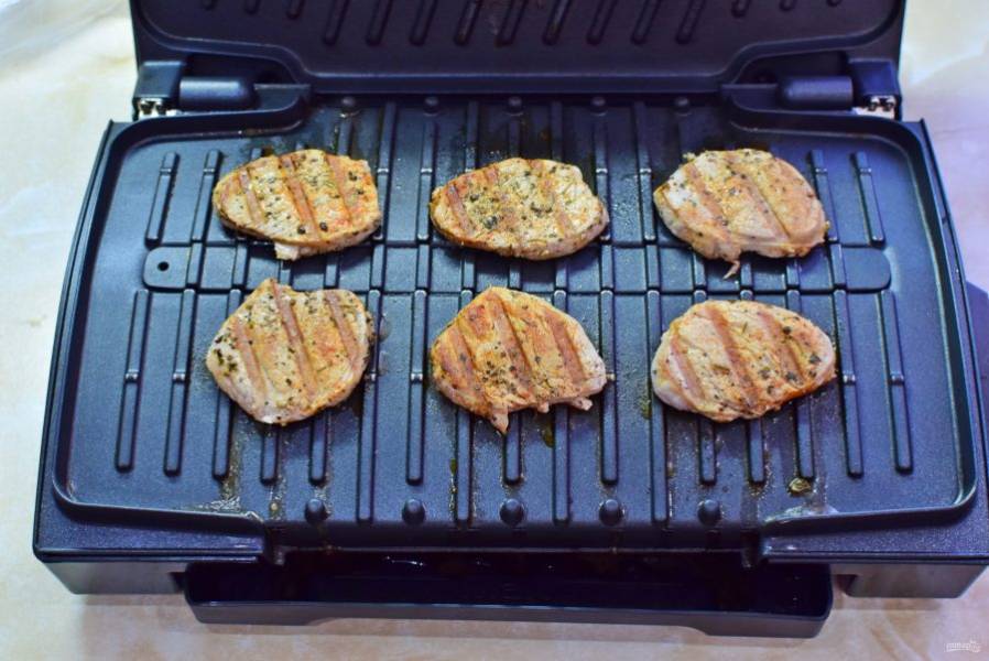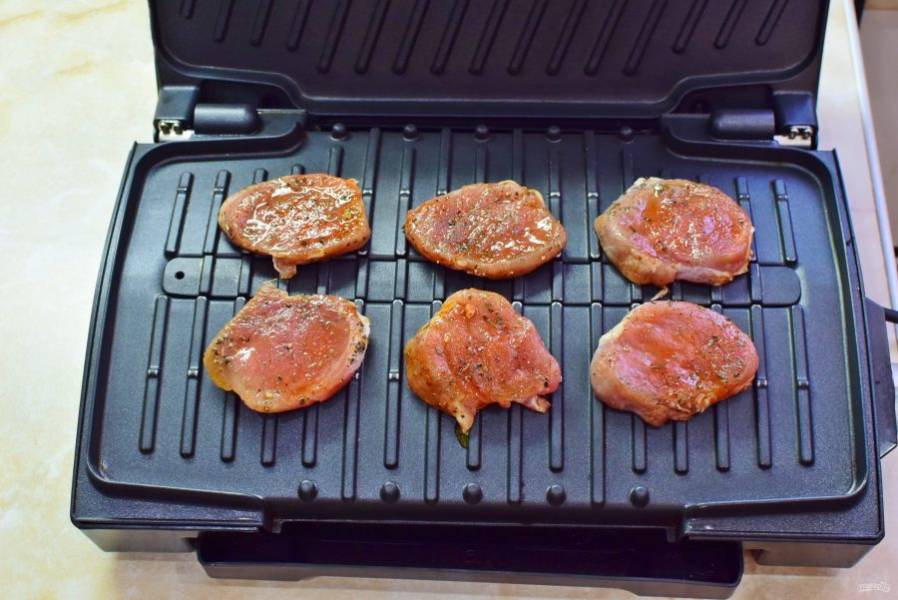 Электрогриль разогрейте до горячего состояния. Поставьте средний режим. Выложите мясо на гриль и накройте крышкой. Готовьте мясные медальоны 6-8 минут, в зависимости от толщины кусочков.