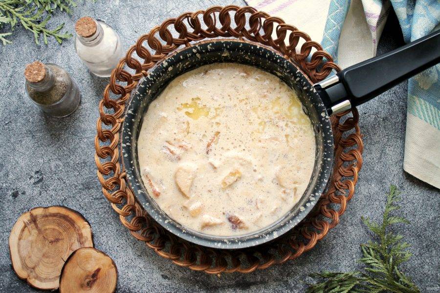 Влейте к грибам сливки, посолите и протушите еще 2-3 минуты.