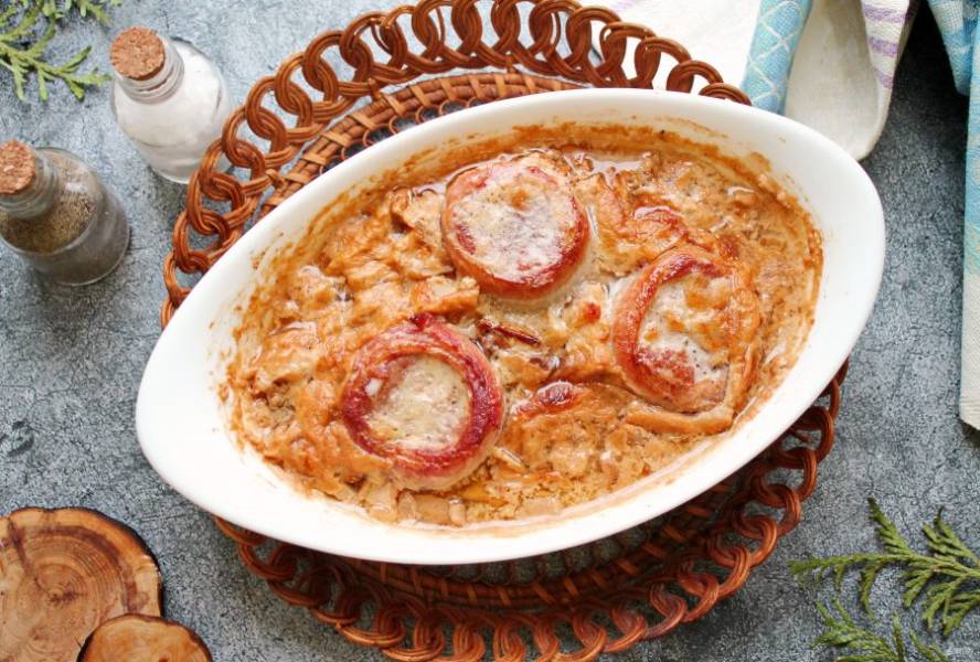 Переложите медальоны в форму для запекания и залейте грибным соусом.