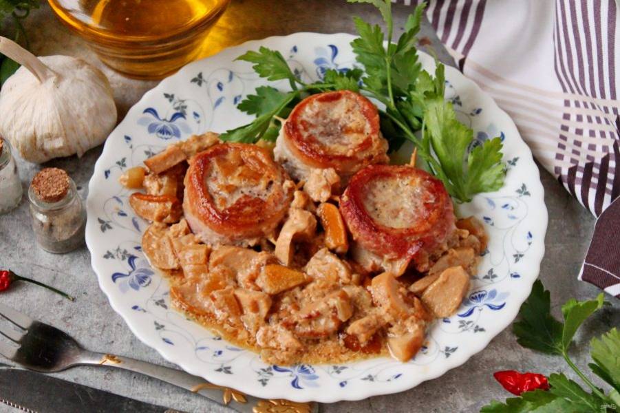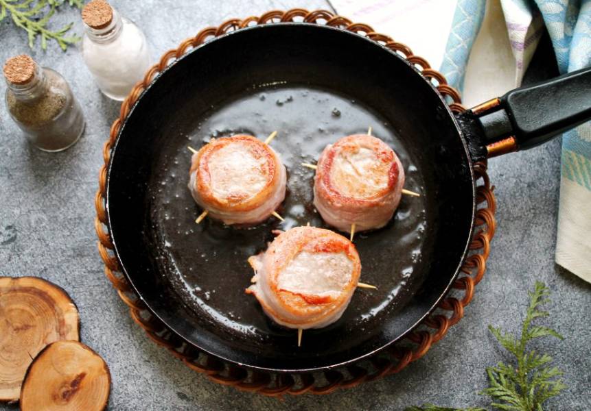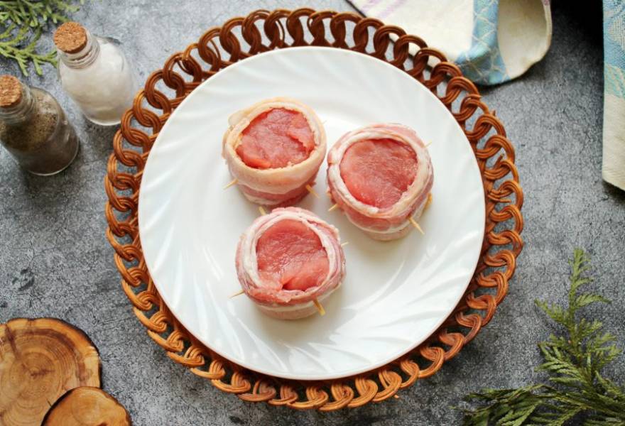 Вырезку острым ножом зачистите от пленок и жил, сполосните и обсушите. Порежьте ее на кусочки толщиной 4 сантиметра, посолите и поперчите. Обверните каждый кусочек в бекон и закрепите его зубочистками. Дайте медальонам постоять 15-20 минут.